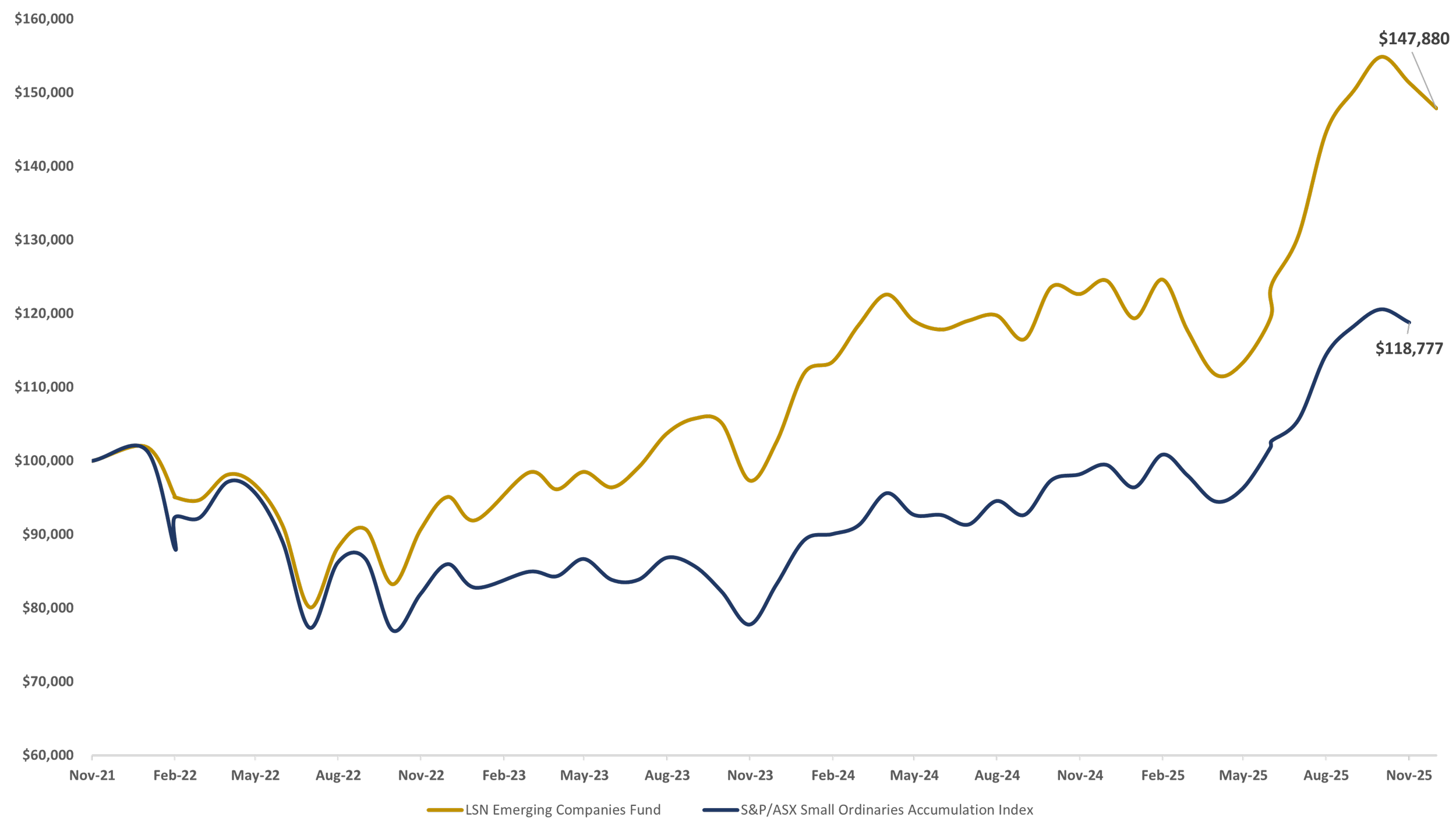 | LSN Emerging Companies Fund | -0.4% | +0.2% | +26.3% | +17.9% | +50.6% | +10.7% |